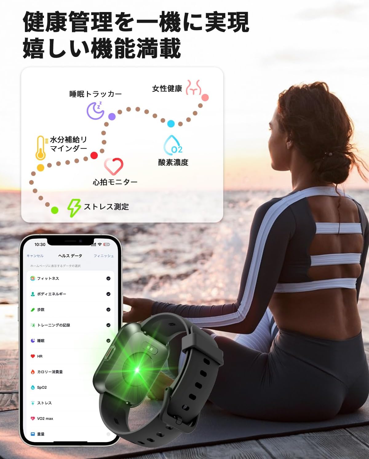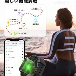 - 【睡眠トラッカ&酸素濃度&心拍計&ストレスレベル&女性健康】スマートウォッチに欠かせない機能といえば体調管理です。睡眠時の状態、酸素濃度、ストレスレベル、心拍なども計測できるようになっています。スマートウォッチを睡眠時に身につけることで睡眠の質を分析することも可能です。毎日の睡眠時間、心拍、ストレスレベルを計測し、眠りの深さを細かく測定してくれます。さらに、酸素飽和度を測定できる機能が搭載されて、自宅でお手軽に測定ができます。また、生理周期の記録や排卵日の予測が表示される女性に嬉しい機能もついて、専用のスマートフォンアプリで生理の期間や、生理痛の症状・体調の変化を記録することで、日々の体調管理に役立ちます。