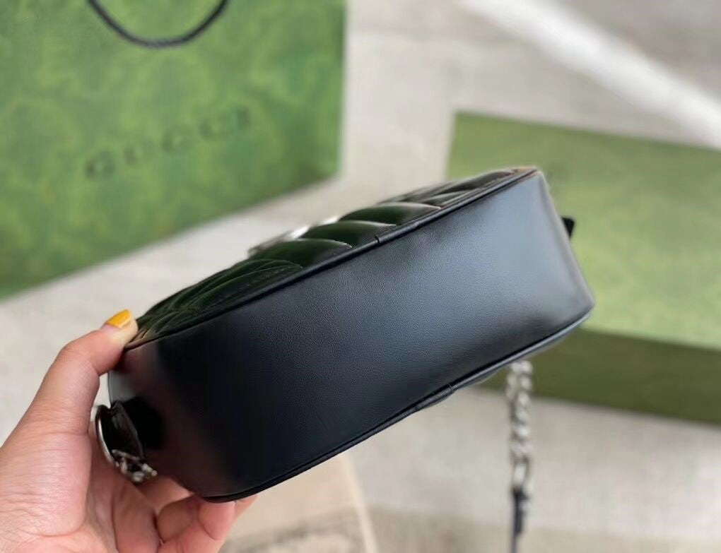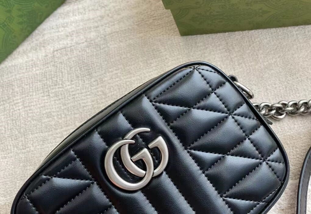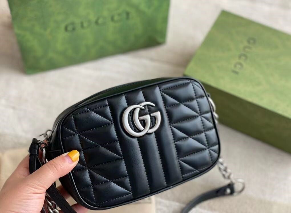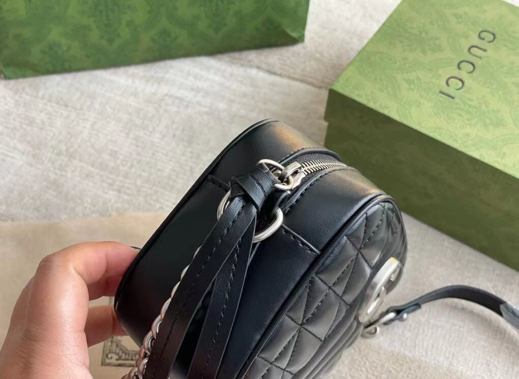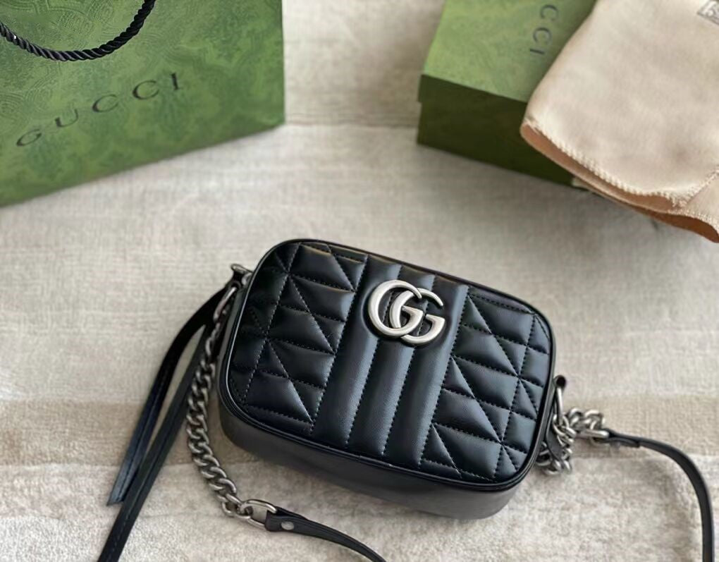 グッチの寵児の選りすぐりの手提げ袋の一員として、GGマーモンシリーズはそのシンボル的なダブルG字母のインターリーブ部品とキルティング皮革で高く評価されています。グッチ「Arria-ファッションアリア」シリーズでは、GGマーモンシリーズが幾何学的なスタイルでクラシカルな素材を表現し、シルバー調のダブルGのアクセサリーを組み合わせて、この驚くべき黒のトランペットリュックサックを発売しました。