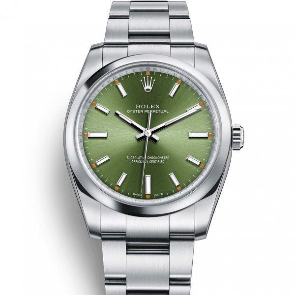 オイスター パーペチュアル 34 はオリーブグリーンダイアルとオイスターブレスレットを備える。